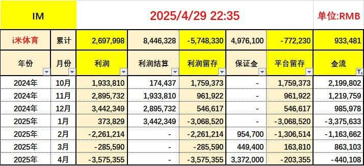 更令人震惊的是,i米体育在2024年12月才上线,自称是“十年老台”,但实际从2024年12月至2025年4月的总盈利仅269万元,平台总金流才93万元,根本难以支撑高额佣金及大额提款。