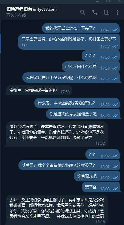 代理尝试登陆后台查看情况却发现密码被修改、邮箱被删除,无法找回账户。联系招商后,对方竟直言平台准备“黑掉代理和会员”,并承认公司随时可能关台跑路。