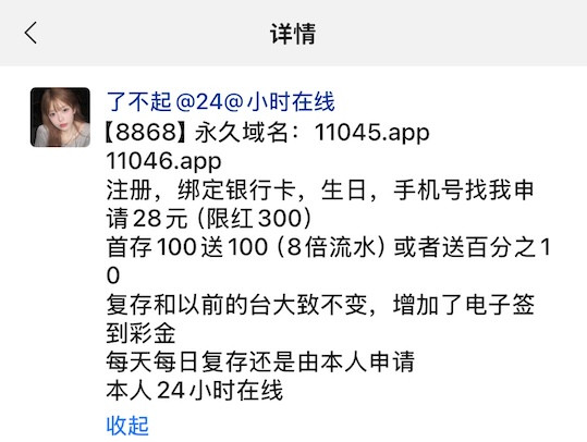 白菜社区会员 8868体育注册绑定好消息后联系旺旺领取送28 到账情况:自测【充值后果自负】 领取方式:联系旺旺:3388444 安全系数:低 平台资历:未知 会员评分:★☆☆☆☆ 申领网址:http://11045.app/ 提现要求:最低提现额度为100元 图例介绍
